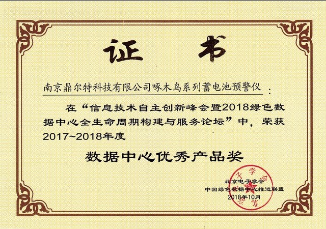 科技有限公司啄木鸟系列蓄电池预警仪在“信息技术自主创新峰会暨2018绿色数据中心全生命周期构建与服务论坛”中,获得由北京电子学会颁发的数据中心优秀产品奖。